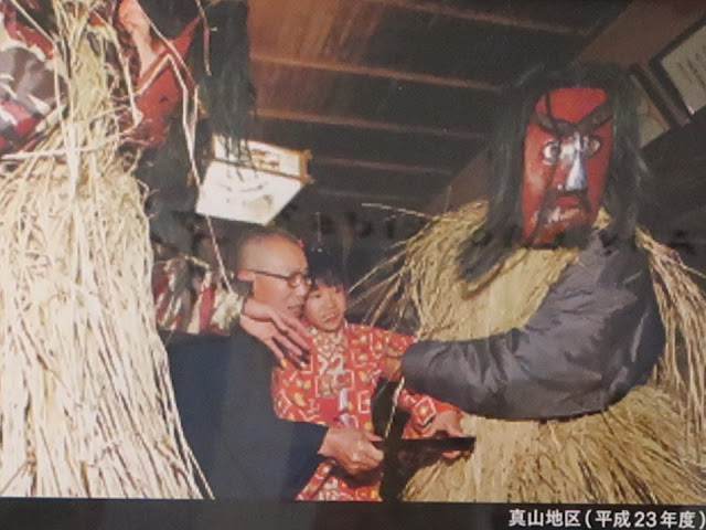 This is Sedo festival which is held in Shinzan Shrine, which is next to the museum, for a thousand years. It is thought that Namahage are similar to demons which grab baked mochi cakes and return to the mountain. Mochi is thought to be a substitution of a human sacrifice.