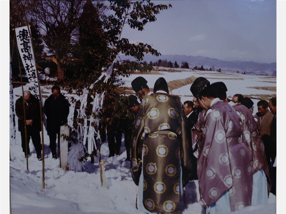 本殿遷座祭の百日前、穗髙神社の一里四方に榊を立て注連縄を張り、神領地とします。厳かですね。