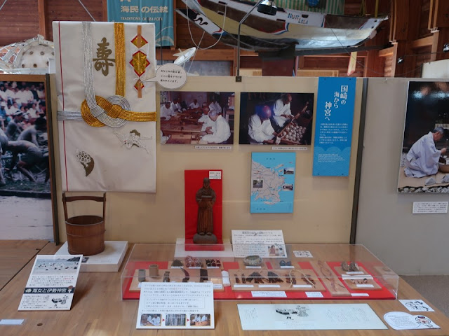 Not only prayers but also festivals are exhibited. Fishing a model of a bonito or a whale in the festival (left), the festive boat race (center) and the talisman which decollates their entrance (right) are exhibited.