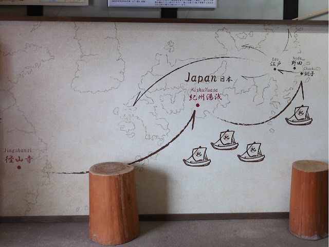 湯浅で始まった醤油製造(岡正(休憩所)のパネル):禅僧(覚心)が鎌倉時代に宋から持ち帰った味噌を元に金山寺味噌を作っていたところ、桶の底に溜まった液で煮物を作ると美味しいことを発見。醤油の原型を作り上げました。湯浅の醤油は濃口で、江戸で好まれ、関東で醤油醸造をする者も現れました。
